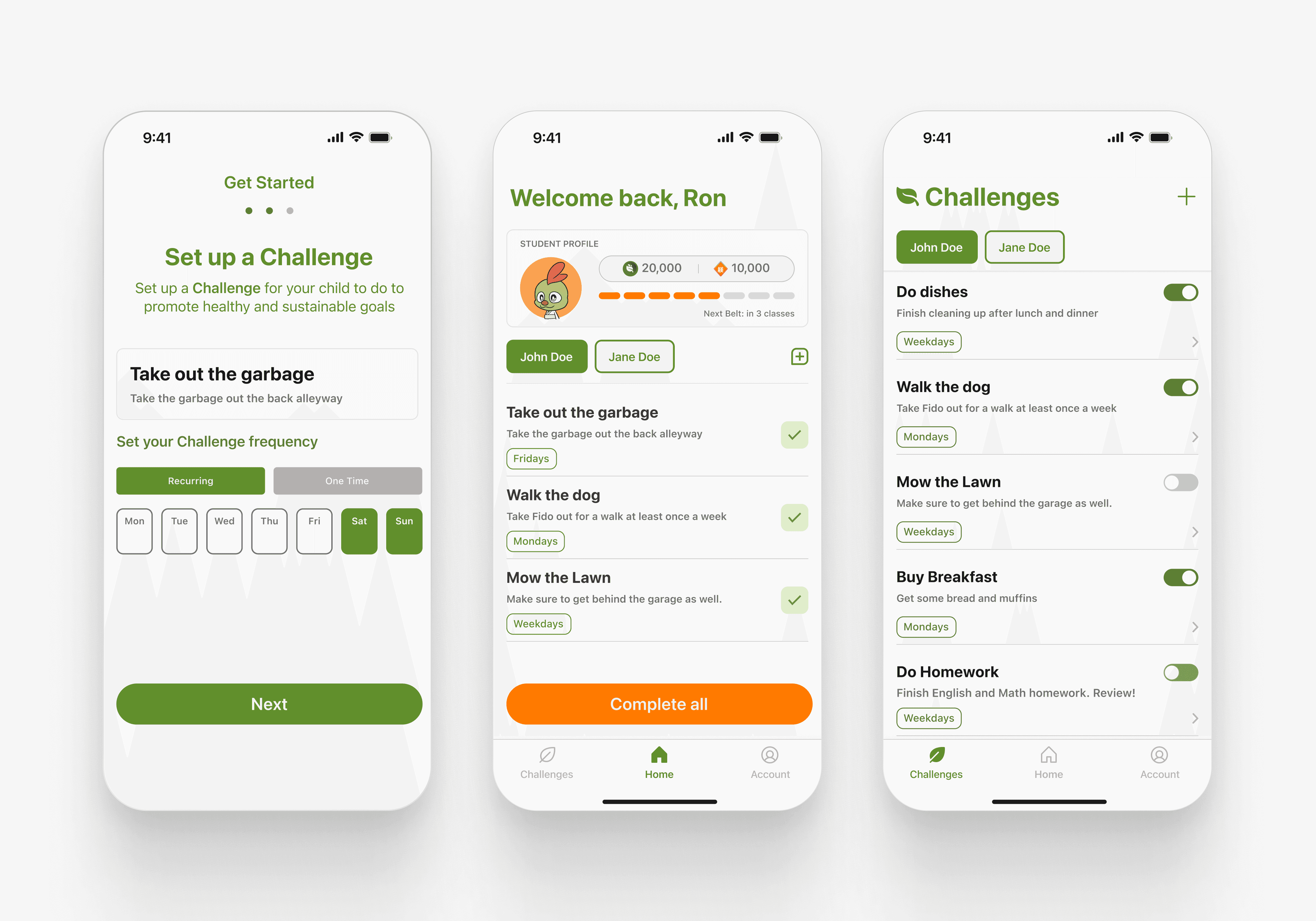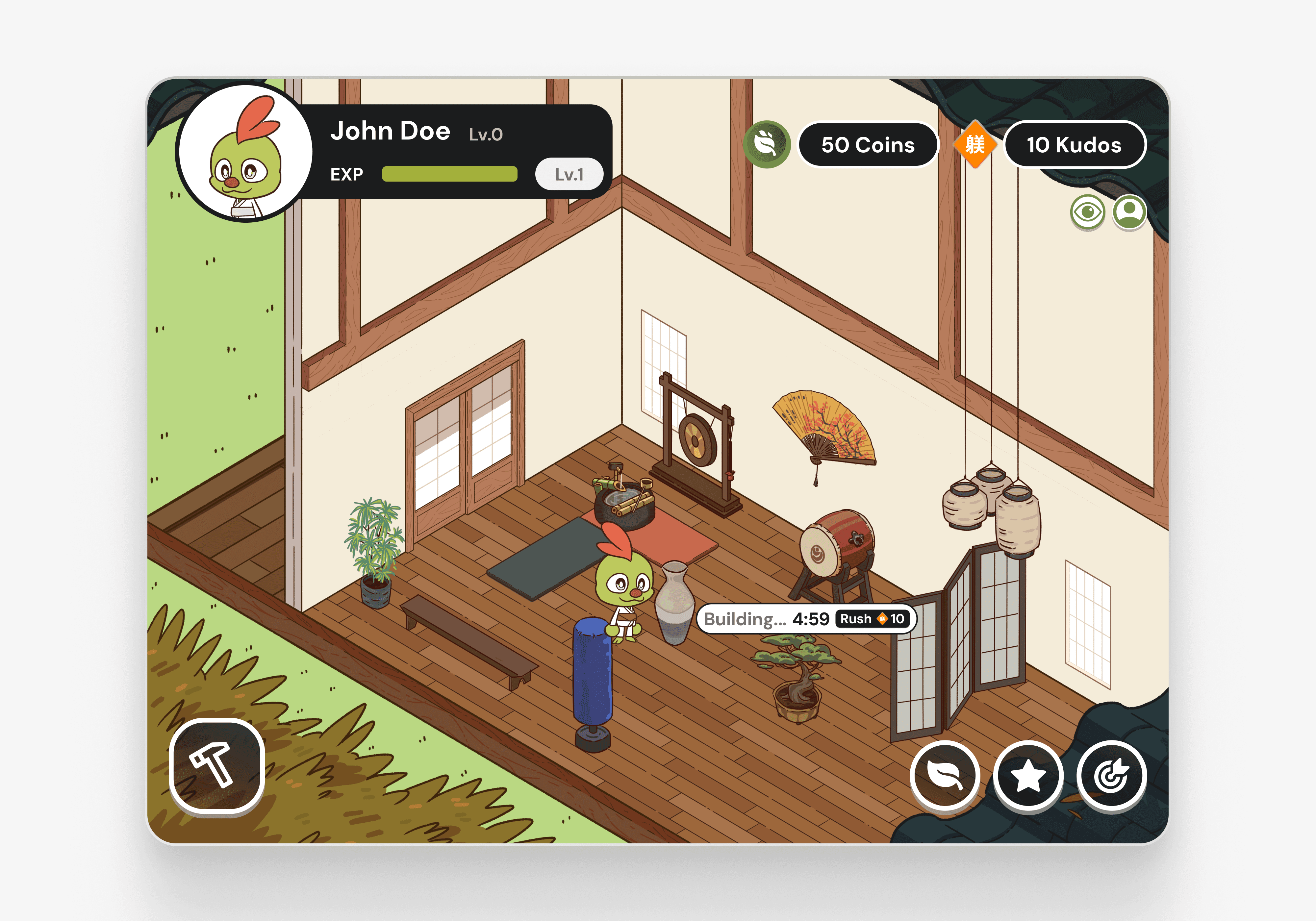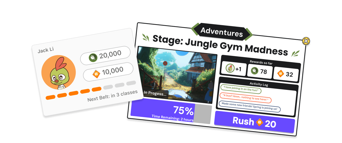 Rounding the experience out for the students, we wanted to push the agenda of retention through positive reinforcement and internal motivations. We did this through building out a game for the students that synced with the Challenges set by parents and attendance in classes. As the students progressed in giving back and attending classes, they would be awarded with in-game rewards, incentivizing them to improve their own dojo student and decorating their personal dojos.