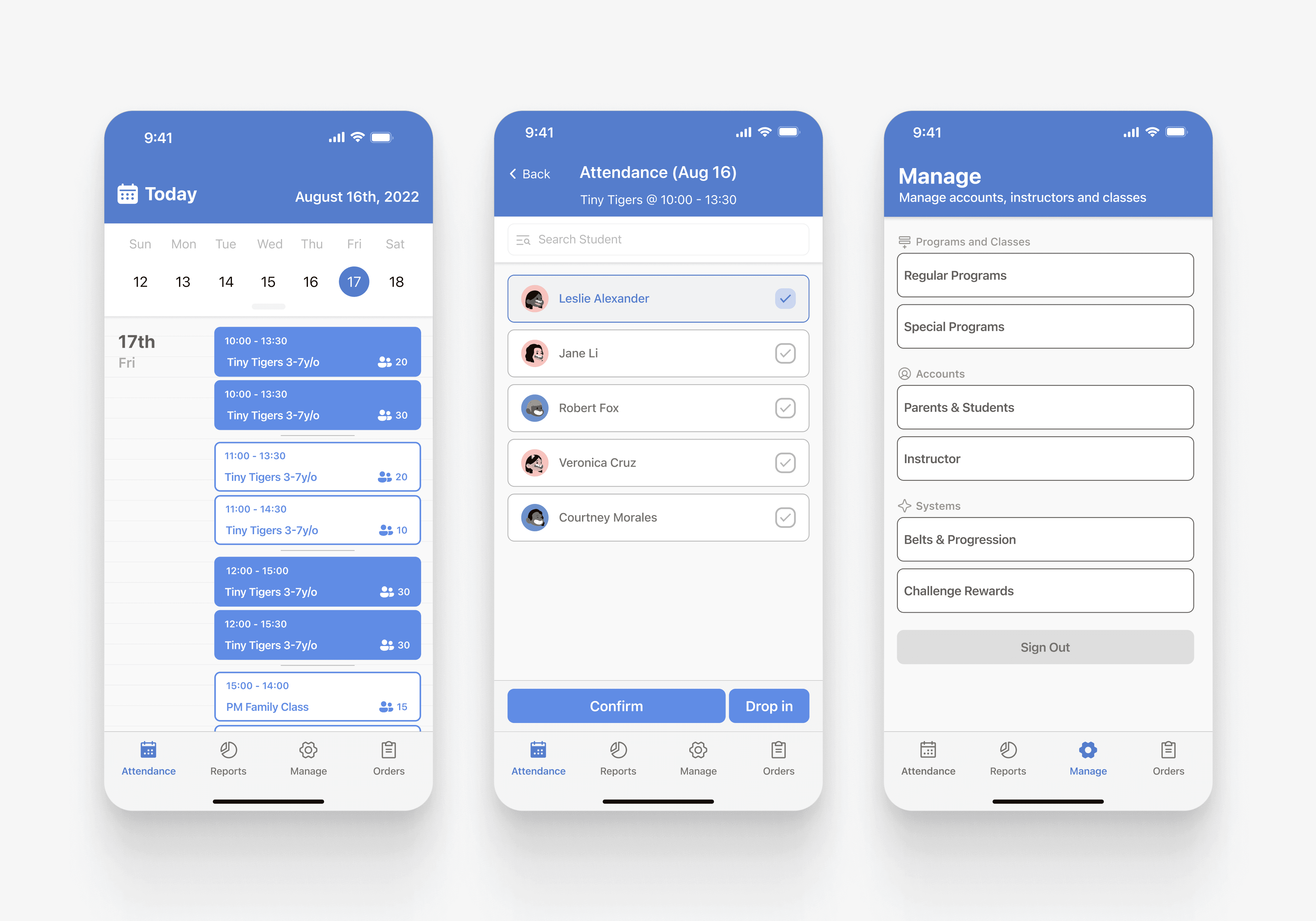 Develop a management tool that helps instructors and parents keep track of the child's in-class progression.