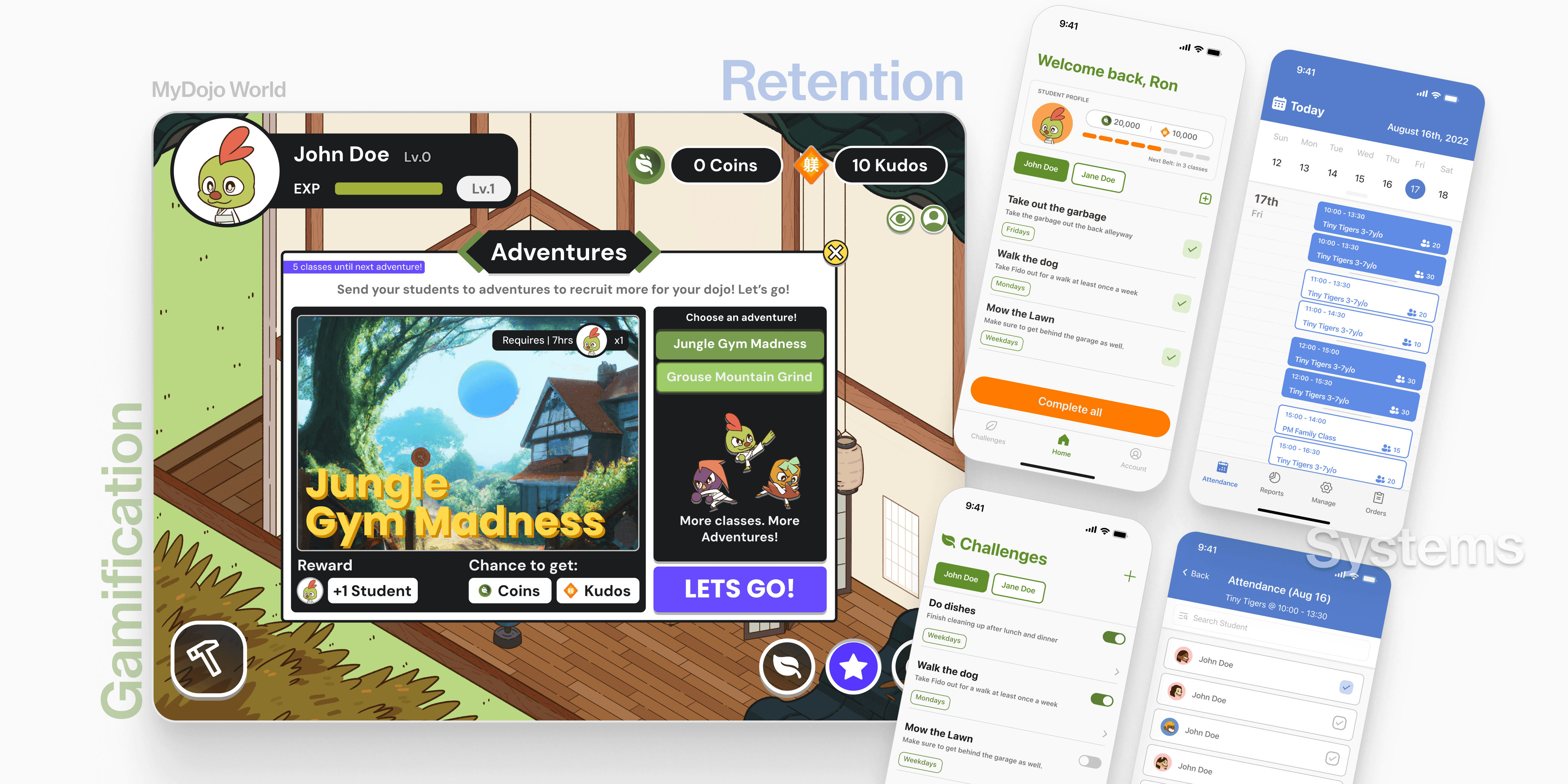 The MyDojo World system was designed to address this problem of engagement and retention for the martial arts business, facilitating administrative tasks while including elements of gamification to play on intrinsic motivators.