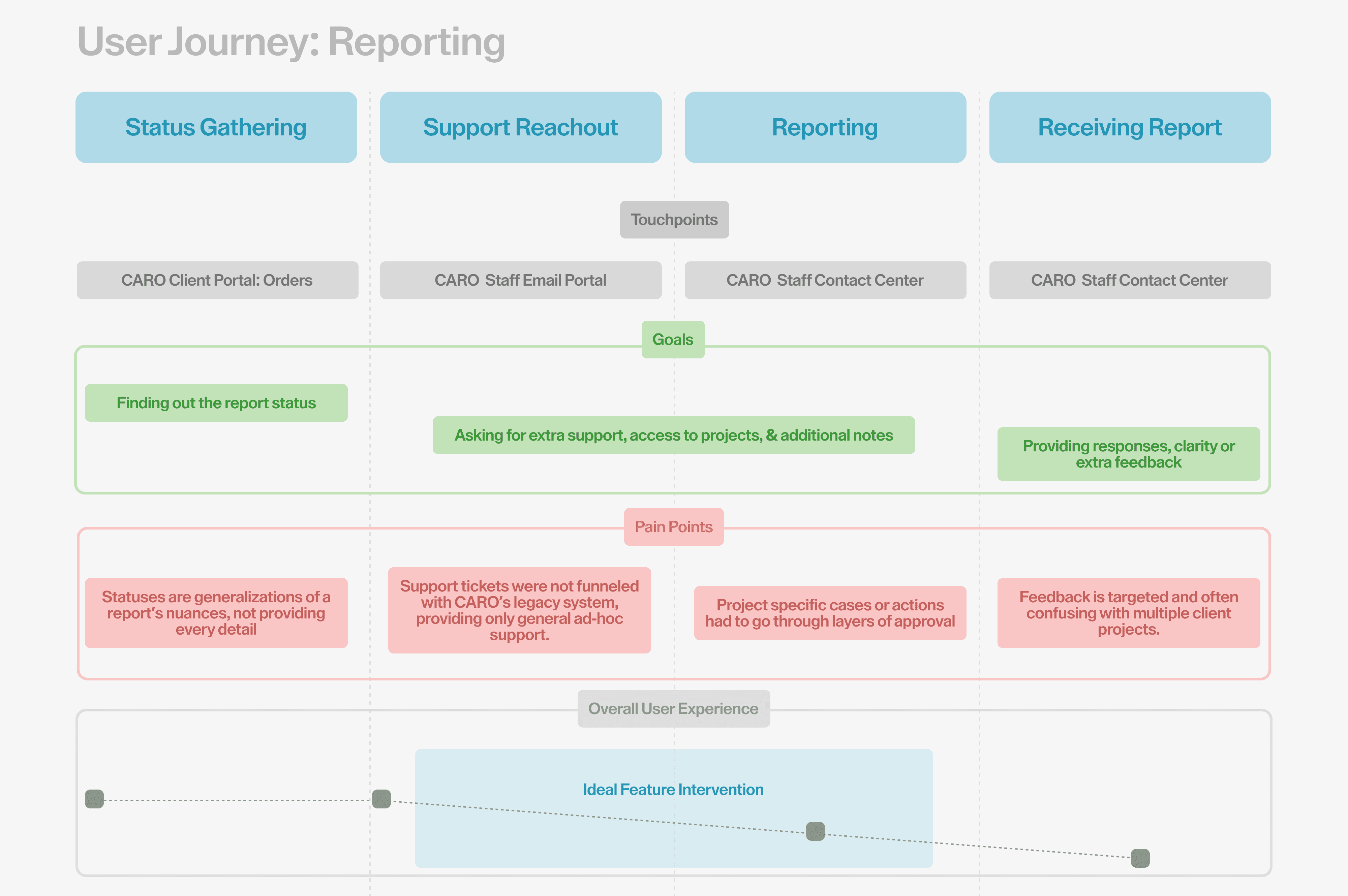 I also took a closer look at the specific user journey of the CARO clients, identifying key stages in which the user experienced increasing levels of friction. This eventually led to discovering an ideal points of entry for the feature so as to design it to be more integrated with the existing user actions.