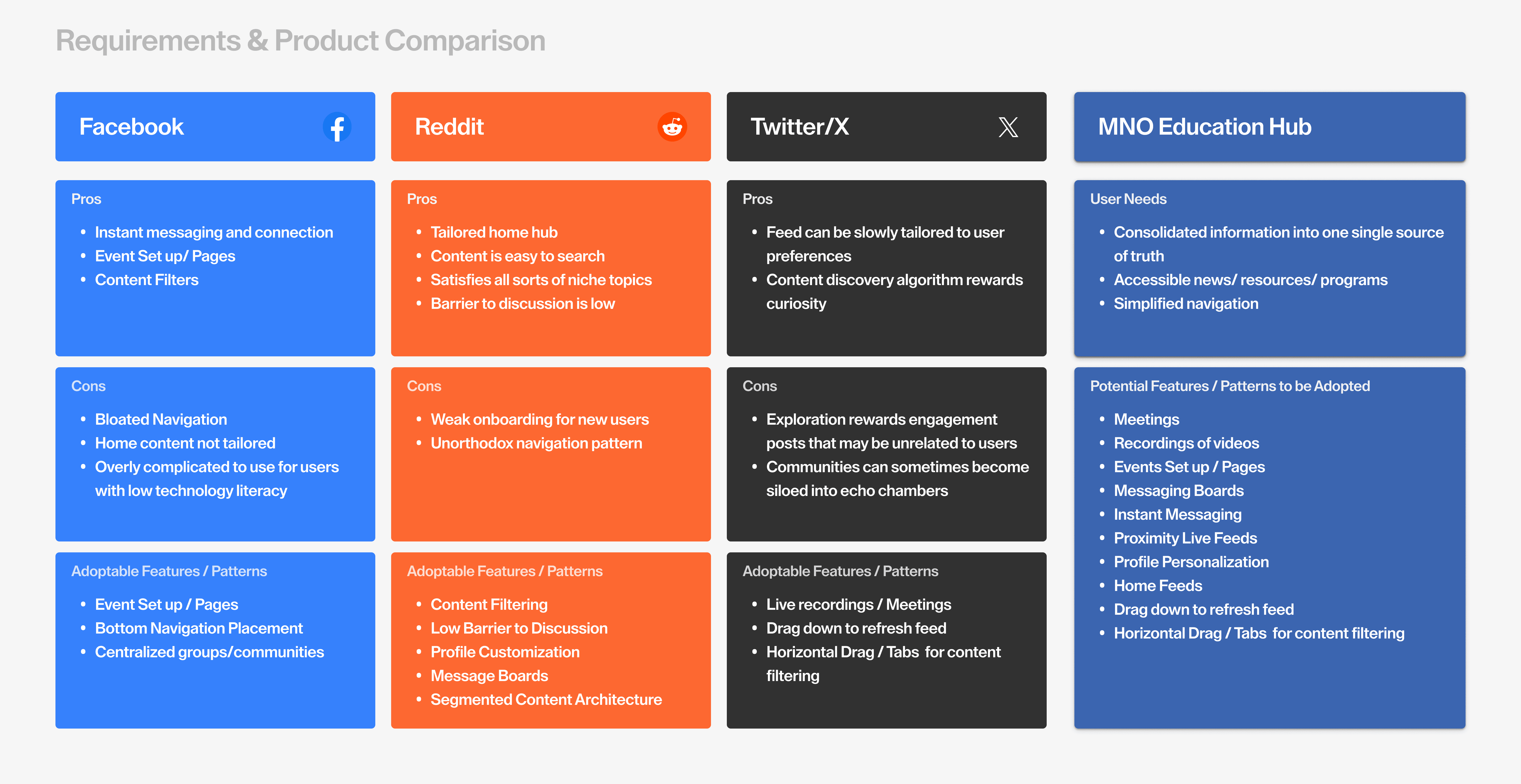 By breaking down user patterns and features of existing social platforms, we explored features/patterns that would provide the most value to the target groups' needs.